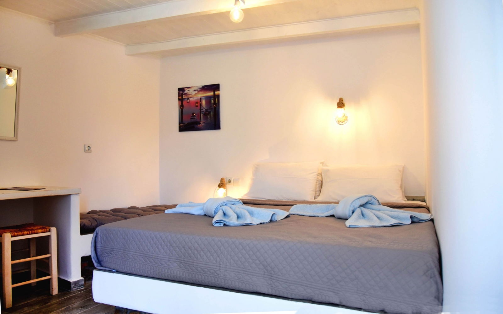 Sunshine Apartment has a super double bed and is strictly a double room. It does not have a kitchen, only a toaster, a kettle. With its own small outdoor area.
