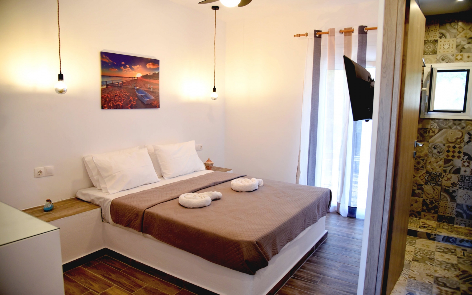 Apartment Sun is a Double-room apartment. It has a big double bed and a built-in sofa. Apartment Sun have electric stove with oven, household utensils, toaster, kettle, 2 T.V. , large refrigerator. It has its own outdoor terrace. It can serve up to three people